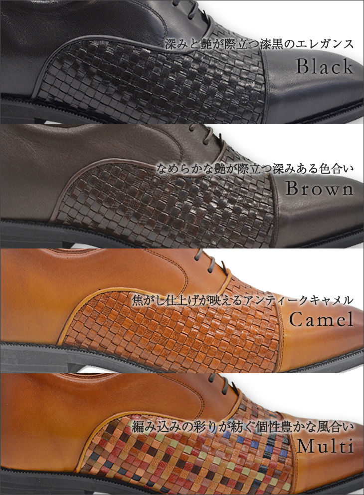 編み込みの彩りが紡ぐ「マルチ」、しなやかな革が心地よい「ブラウン」、焦がし仕上げが映える「キャメル」、漆黒の艶が映える「ブラック」など、それぞれに異なる魅力を持つカラーラインナップをご用意しました。